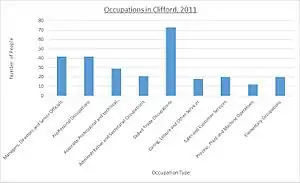 The population graph shows an increase in population up until 1840 when the population of Clifford began to decrease. The movement of people away from rural areas in the early 19th century was due to technical advances and socio-economic changes leading to urban areas becoming more densely populated.[11] The technical advances meant that fewer people were needed in the agricultural industry, and this allowed people to move into towns and cities and begin to work for the labour industry.[11] Therefore, this continuous decrease in population resulted in an overall net decrease from 1801 to 2011.