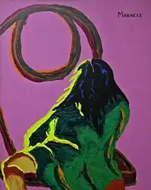 Many of Maracle's works were kinetic, depicting native dancers, historical events, animals, athletes.[3] Maracle's dark humor is brought to light in his painting entitled "The Plight of the Urban Indian". It depicts three figures standing together: one has a gaping mouth with white teeth that glare out, another appears sombre with a drooping head, while the third appears complacent. A card adjacent to the installation described how the figures were meant to demonstrate the maladjustments, dislocations and disorientations of Natives within a dominant society that is sometimes hostile.[8]