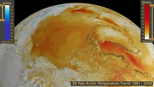 An increase in the global emission levels of carbon dioxide means significant arctic sea ice decline.[51] The reduction of sea ice is currently not just impacting global temperature and the climate crisis. It is also significantly harming indigenous nations in unprecedented ways. Indigenous peoples in the Arctic include indigenous people who live in Canada, Greenland, the United States, Norway, and Russia. In Canada, there are nine major Inuit groups. They are the Labradormiut (Labrador Inuit), Nunavimmiut (Nunavik Inuit or Ungava Inuit), Nunatsiarmiut (Baffin Island Inuit), Iglulingmiut (Iglulik Inuit), Kivallirmiut (Caribou Inuit), Netsilingmiut (Netsilik), Inuinnait (Copper Inuit), Qikirtamiut (Sanikiluaq Inuit), and Inuvialuit (Western Arctic Inuit or Mackenzie Delta Inuit).[52] While smaller in number, there are additionally non-Inuit indigenous nations in the northern regions of Canada, such as the Cree, Dene, and Innu peopless.[52] In Greenland, indigenous people are Inuit.[53] They comprise most of the population on the island.[53] In the United States, Arctic indigenous peoples reside in Alaska. While there are many different ways to categorize them, they are often grouped regionally.[54] In the south, there are the Yup'ik (Cup'ik), Eyak, Haida, Tlingit, and Tsimshian peoples.[54] In the north, there are the St. Lawrence Island Yupik and Iñupiat peoples.[54] The interior of Alaska is home to Athabascan peoples.[54] The Alutiiq and Aleut (Unangax) peoples reside in the Aleutian Islands and south-central Alaska.[54] The Sámi people exist in Norway, Finland, Sweden, and Russia, and are the only indigenous group within the European Union.[55][56] There are more than 180 indigenous peoples who reside in the land currently known as Russia.[57] These include the Buryats, Enets, Evenks, Khakas, Komi, Oroks, Nenets, and Yakuts.[58] Iceland is the sole Arctic country which does not have any indigenous nations as its citizens are mostly descended from northern Europeans.[59] Because of melting ice, rising sea level, increased erosion, and loss of traditional food and hunting due to climate change, all of these indigenous groups are at great risk.