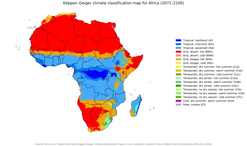 Sharp global temperature and sea level changes, shifting precipitation patterns and increased frequency of extreme weather events are some of the main impacts of climate change as identified by the Intergovernmental Panel on Climate Change (IPCC).[105] The MENA region is especially vulnerable to such impacts due to its arid and semi-arid environment, facing climatic challenges such as low rainfall, high temperatures and dry soil.[105][106] The climatic conditions that foster such challenges for MENA are projected by the IPCC to worsen throughout the 21st century.[105] If greenhouse gas emissions are not significantly reduced, part of the MENA region risks becoming uninhabitable before the year 2100.[107][108][109]West Africa and the Sahel