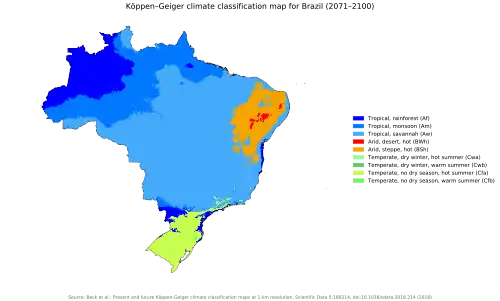 In 2022 study found that 28% of the agricultural land in Brazil is no more climatically optimal due to climate change and to change in local climate as a result of deforestation. The number will go to 51% by 2030 and 74% by 2060 if the change in climate will continue in the same way.[42][43]