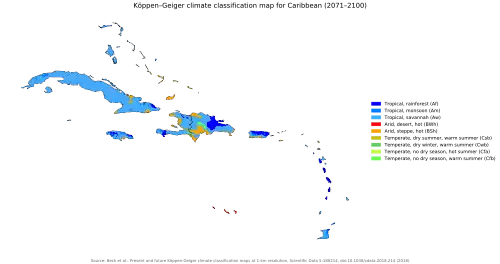 Climate change in the Caribbean poses major risks to the islands in the Caribbean. The main environmental changes expected to affect the Caribbean are a rise in sea level, stronger hurricanes, longer dry seasons and shorter wet seasons.[1] As a result, climate change is expected to lead to changes in the economy, environment and population of the Caribbean.[2][3][4] Temperature rise of 2 °C above preindustrial levels can increase the likelihood of extreme hurricane rainfall by four to five times in the Bahamas and three times in Cuba and Dominican Republic.[5] Rise in sea level could impact coastal communities of the Caribbean if they are less than 3 metres (10 ft) above the sea. In Latin America and the Caribbean, it is expected that 29–32 million people may be affected by the sea level rise because they live below this threshold. The Bahamas is expected to be the most affected because at least 80% of the total land is below 10 meters elevation.[6][7]
