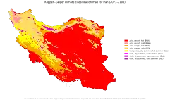 Climate change is expected to lead to a 2.6 °C increase in temperatures and 35% decrease in precipitation in Iran during the 21st century.[8] Climate change is also expected to lead to extended periods of drought and increased frequency of flooding.[9]