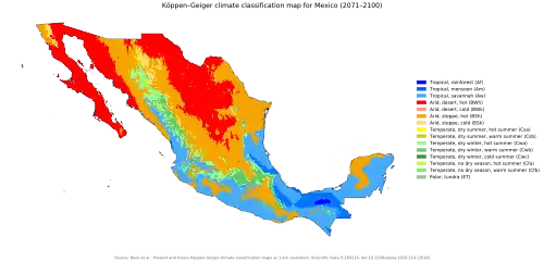 Climate change in Mexico is expected to have widespread impacts on Mexico: with significant decreases in precipitation and increases in temperatures. This will put pressure on the economy, people and the biodiversity of many parts of the country, which have largely arid or hot climates. Already climate change has impacted agriculture,[1] biodiversity, farmer livelihoods, and migration,[2][3] as well as "water, health, air pollution, traffic disruption from floods, [and] housing vulnerability to landslides."[4]