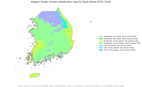 South Korea is experiencing a rapid temperature increase. Higher daily maximum and minimum temperatures are very likely to increase in East Asia. There are more severe warm extremes, but less severe cold extremes.[23] These mean temperature increases, especially the temperature increase rate after the 1950s is 1.5 times higher than before the 1950s. In the absence of greenhouse gas mitigation efforts (RCP8.5 scenario), between 2071 and 2100, winters are projected to be about 40 days shorter and summers about 40 days longer than in the most recent decade (2009-2018).[24] When average temperature comparison for comparing 20th-century and 21st-century temperature averages, it is shown that there is a 4 °C increase. The mean yearly temperature for South Korea is 10~15 °C,[25] which means that future warming will result in the expansion of a subtropical climate zone with average temperatures above 27 °C on the Korean Peninsula.[26] The recent subtropical zone is located on the lower seaside of the Korea Peninsula, but as accelerated temperatures increase, it will result in the subtropical zone move migrating northward. Therefore, by 2100 the subtropical zone is projected to expand its region to the north end of Taebaek Mountains.[27]