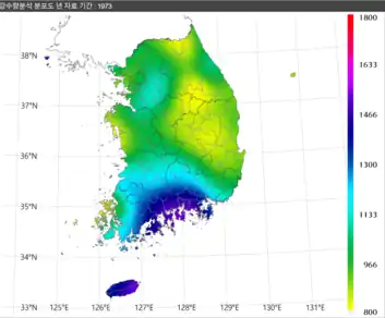 ![]() Precipitation distribution plot(1973) | Copyright(c)2015 KMA. The precipitation distribution plot is generated using Barnes interpolation based on observations from 95 points of ground weather observation. |