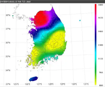 ![]() Precipitation distribution plot(2022) | Copyright(c)2015 KMA. The precipitation distribution plot is generated using Barnes interpolation based on observations from 95 points of ground weather observation. |