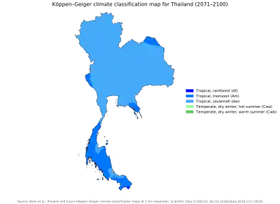 Extreme heat in Southeast Asia today reduces working hours by 15–20%, and that figure could double by 2050 as climate change progresses, according to a paper published in the Asia-Pacific Journal of Public Health. The paper projects a loss of six percent of Thailand's GDP by 2030 due to a diminution of working hours caused by rising temperature.[23] A paper published in Nature, by Mora, et al.,[24] forecasts that "...things will start going haywire in the tropics at around [sic] the year 2020..."[25] Some scientists project that by 2100, "...most of the low and mid latitudes will be uninhabitable because of heat stress or drought..."[26] A study published in the Proceedings of the National Academy of Sciences examined how worst-case CO2 emissions would affect the human habitat: by the end of the century, the average human will experience a temperature increase of 7.5 °C when global temperatures increase 3 °C the study predicts. At that level, about 30% of the world's population would live in extreme heat, defined as an average temperature of 29 °C. In 2020, this temperature is rare outside the hottest parts of the Sahara Desert. Thailand is among those geographies affected, with a projected 62 million Thais exposed to extreme heat.[27]