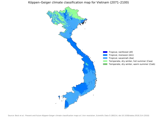 Furthermore, changes in maximum temperature in Vietnam varied in the range from −3 °C to 3 °C. Changes in minimum temperatures mostly varied in the range from −5 °C to 5 °C. Both maximum and minimum temperatures have tended to increase, with minimum temperatures increasing faster than maximum temperatures, reflecting the trend of global climate warming.[9]