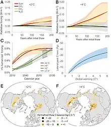 A 2018 perspectives article discussing tipping points in the climate system activated around 2 °C (3.6 °F) of global warming suggested that at this threshold, permafrost thaw would add a further 0.09 °C (0.16 °F) to global temperatures by 2100, with a range of 0.04–0.16 °C (0.072–0.288 °F)[134] In 2021, another study estimated that in a future where zero emissions were reached following an emission of a further 1000 Pg C into the atmosphere (a scenario where temperatures ordinarily stay stable after the last emission, or start to decline slowly) permafrost carbon would add 0.06 °C (0.11 °F) (with a range of 0.02–0.14 °C (0.036–0.252 °F)) 50 years after the last anthropogenic emission, 0.09 °C (0.16 °F) (0.04–0.21 °C (0.072–0.378 °F)) 100 years later and 0.27 °C (0.49 °F) (0.12–0.49 °C (0.22–0.88 °F)) 500 years later.[135] However, neither study was able to take abrupt thaw into account.