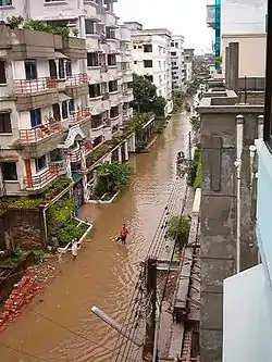Climate change has forced many people of Bangladesh living in rural areas to migrate to cities that has caused a sharp rise in the slum population of Dhaka.[8] As Bangladesh is already less than 20 feet above sea level, thus there are fears that by the end of the 21st century, more than a quarter of the country will be inundated and 15 million people will be displaced.[8] The population of Dhaka, currently 13 million people, is projected to increase to 20 million by the year 2025. This raises fears of water-borne diseases and outbreaks of several other diseases.[9] While a UN and WWF report warned that Dhaka tops the risk of climate change in Asia.[10]