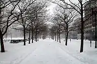 Massachusetts sees a wide variety of temperatures throughout the year, the average being as high as 95 °F (35 °C) in the summertime, and as low as -8 °F (-22 °C) in the wintertime.[10] In the capital and largest city of Boston, the hottest month of the year is July, with an average high temperature of 81 °F or 27.2 °C and an average low temperature of 66 °F (18 °C).[10] The coldest month of the year is January, with an average high temperature of 36 °F or 2.2 °C, and an average low temperature of 22 °F or −5.6 °C.[10] Boston has seen 70 °F or 21.1 °C twice in recorded history during February. The highest recorded temperature for February was 73 °F or 22.8 °C on February 23, 2017. The maximum temperature recorded in March was 90 °F or 32.2 °C on March 31, 1998. Spring in Boston can be warm, with temperatures as high as the 90s when winds are offshore, though it is just as possible for a day in late May to remain in the lower 40s due to cool ocean waters. The hottest month is July, with an average high of 82 °F or 27.8 °C and average low of 66 °F or 18.9 °C, with conditions usually humid.[11] Periods exceeding 90 °F or 32.2 °C in summer or below 10 °F or −12.2 °C in winter are not uncommon, but rarely prolonged. The record high temperature in Boston is 104 °F or 40 °C on July 4, 1911, and the record low −18 °F or −27.8 °C, recorded on February 9, 1934.[12]