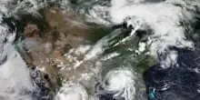 During the summer, the Southwest monsoon combined with Gulf of California and Gulf of Mexico moisture moving around the subtropical ridge in the Atlantic Ocean bring the promise of afternoon and evening thunderstorms to the southern tier of the country as well as the Great Plains.[15] Equatorward of the subtropical ridge, tropical cyclones enhance precipitation (mostly from August to October) across southern and eastern sections of the country, as well as Puerto Rico, the United States Virgin Islands, the Northern Mariana Islands, Guam, and American Samoa.[16] Over the top of the ridge, the jet stream brings a summer precipitation maximum to the Great Lakes. Large thunderstorm areas known as mesoscale convective complexes move through the Plains, Midwest, and Great Lakes during the warm season, contributing up to 10% of the annual precipitation to the region.[17]