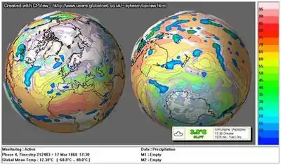 The real-time desktop visualisation for the model launched in 2003 was developed[24] by Jeremy Walton at NAG, enabling users to track the progress of their simulation as the cloud cover and temperature changes over the surface of the globe. Other, more advanced visualisation programs in use include CPView and IDL Advanced Visualisation. They have similar functionality. CPView was written by Martin Sykes, a participant in the experiment. The IDL Advanced Visualisation was written by Andy Heaps of the University of Reading (UK), and modified to work with the BOINC version by Tesella Support Services plc.
