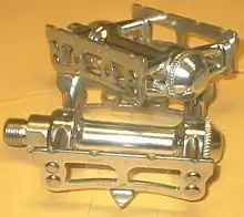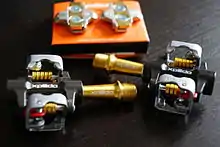 Clipless pedals (also clip-in or step-in) require a special cycling shoe with a cleat fitted to the sole, which locks into a mechanism in the pedal and thus holds the shoe firmly to the pedal. Most clipless pedals lock onto the cleat when stepped on firmly and unlock when the heel is twisted outward, although in some cases the locking mechanism is built into the cleat instead of the pedal. Clipless refers to the toe clip (cage) having been replaced by a locking mechanism and not to platform pedals which would normally not have toe clips. The clipless pedal was invented by Charles Hanson in 1895.[3] It allowed the rider to twist the shoe to lock and unlock and had rotational float (the freedom to rotate the shoe slightly to prevent joint strain).[4] The M71 was a clipless pedal designed by Cino Cinelli and produced by his company in 1971. It used a plastic shoe cleat which slid into grooves in the pedal and locked in place with a small lever located on the back side of the pedal body. To release the shoe a rider had to reach down and operate the lever, similar to the way a racing cyclist had to reach down and loosen the toestrap. The lever was placed on the outside edge of the pedal so that in the event of a fall the lever hitting the ground would release the foot. The pedal was designed for racing, in particular track racing, and because of the need to reach down to them to unclip, they have been referred to as "death cleats".[5] In 1984, the French company Look applied downhill snow skiing binding or cleat technology to pedals, producing the first widely used clipless pedals. Initially used by triathletes in order to facilitate faster "transitions", Bernard Hinault's victory in Tour de France in 1985 then helped secure the acceptance of quick-release clipless pedal systems by cyclists. Those pedals, and compatible models by other manufacturers, remain in widespread use today. The cleat is engaged by simply pushing down and forward on the pedal, or, with some designs, by twisting the cleat in sideways. Then, instead of loosening a toestrap or pulling a lever, the cyclist releases a foot from the pedal by twisting the heel outward.