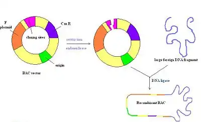 Bacterial artificial chromosomes (BACs) are circular DNA molecules, usually about 7kb in length, that are capable of holding inserts up to 300kb in size. BAC vectors contain a replicon derived from E. coli F factor, which ensures they are maintained at one copy per cell.[4] Once an insert is ligated into a BAC, the BAC is introduced into recombination deficient strains of E. coli by electroporation. Most BAC vectors contain a gene for antibiotic resistance and also a positive selection marker.[2] The figure to the right depicts a BAC vector being cut with a restriction enzyme, followed by the insertion of foreign DNA that is re-annealed by a ligase. Overall, this is a very stable vector, but they may be hard to prepare due to a single origin of replication just like PACs.[14]