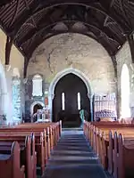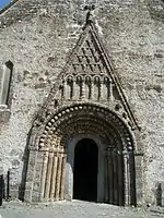 The earliest part of the church dates back to around 1180.[1] Its doorway is the crowning achievement of Hiberno-Romanesque style. It is in six orders, and has a large variety of motifs, animal heads, foliage, human heads etc. Above the doorway is a pointed hood enclosing triangles alternating with bizarre human heads, and below this is an arcade enclosing more human heads. The early 13th century east windows in the chancel is an example of a late Romanesque windows. The chancel arch was inserted in the 15th century, and is decorated with angels, a rosette and a mermaid carrying a mirror. The supporting arches of the tower at the west end of the church are also decorated with 15th century heads, and the innermost order of the Romanesque doorway was also inserted at this time. The sacristy is also 15th century. The church had a Romanesque south transept, which is now in ruins, and a Gothic north transept, which has been removed. In the Roman Catholic church one mile to the south is a 14th-century wooden statue of the Madonna and Child, and on the roadside near this church is a 16th-century tower-house.