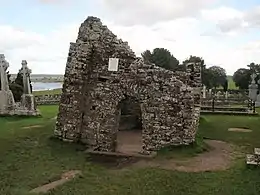 Clonmacnoise monastery was founded in 544 by Saint Ciarán[18] in the territory of Uí Maine where an ancient major east–west land route and early medieval political division (the Slighe Mhor) met at the River Shannon. This strategic location helped it become a thriving centre of religion, learning, craftsmanship and trade by the 9th century, and many of the high kings of Tara (Ard Rí) and of Connacht were buried here.[19] Clonmacnoise was largely abandoned by the end of the 13th century. Today the site includes nine ruined churches, a castle, two round towers and many carved stone crosses.[20]