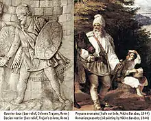 The Romanian popular costume finds its roots in the part of Thracian, Dacian and Getae ancestors and resembles with that of the peoples of the Balkan Peninsula, of course with differences consisting of decorative and colorful details. For example, women portraits carved on Trajan's Column in Rome after the Dacian wars provide information about their clothing. Dacian women wore shirts rippled at the neck. Sleeves were either long and wide or short. The dress was long to the ground, over which sometimes was attached a wide draped mantle. In the feet they wore leather sandals in summer and fur sandals in winter.[4]