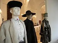 - Căciulă joasă – cylindrical fur cap with the top larger than the base.[7] This is called mocănească, rotată, retezată or turtită and is worn by shepherds on both sides of the southern Carpathians (in Mărginimea Sibiului, Oltenia, Muntenia and Vrancea) and also in Bărăgan Plain and Dobruja due to this area being used for summer pastures by the Carpathian shepherds, and also in Maramureș.