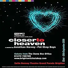 Closer to Heaven is a musical by Jonathan Harvey and Pet Shop Boys. It was premiered in May 2001 at the Arts Theatre in London, opening to mixed reviews, and ran until 13 October 2001. A second production of Closer to Heaven was premiered in Australia in 2005. New off-West End productions premiered in London in 2015 and 2019.