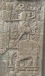 Both the north and the south arch have the same symmetrical decoration. On each side of each arch is a crossed vajra (viśvavajra), above which is an elephant surmounted by a youth riding a mythical creature.[12] At the peak of each arch is a garuda catching a pair of half-human, half-snake nagaraja.[13]