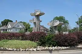 Clouds is a 2000 stainless steel abstract sculpture by Hans Van de Bovenkamp,[1] installed in Toledo's Harvard Terrace, in the U.S. state of Ohio. Each cloud sculpture includes a downward-firing fountain ring simulating rain illuminated by multicolored lighting. The artwork incorporating 3 clouds measures approximately 25 ft high by 30 ft in diameter. It's the centerpiece of a traffic circle named the Harvard Circle Fountain[2][3] at the junction of Harvard Blvd, Broadway St, Glendale Ave and River Rd.