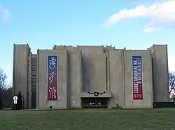 Clowes (/kluːz/) Memorial Hall, which opened in 1963, was co-designed by noted Indianapolis architect Evans Woollen III, of Woollen, Molzan and Partners, and John M. Johansen, a well-known architect who established his practice in New Canaan, Connecticut. The performing hall is notable for its exposed concrete slabs, which are typical of the Brutalist architecture style.[2] Woollen served as the junior partner in the project but was the "driving force behind its design and detail."[3] Since it opened, the architectural community has praised its bold design.[3] In 2021, a six-person panel of American Institute of Architects (AIA) Indianapolis members identified the venue among the ten most "architecturally significant" buildings completed in the city since World War II.[4]
