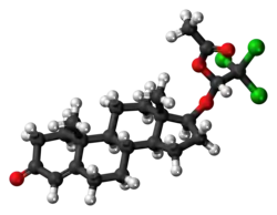 Cloxotestosterone acetate (INN; brand name Caprosem), also known as testosterone 17β-chloral hemiacetal O-acetate, is a synthetic, injected anabolic–androgenic steroid (AAS) and an androgen ether and ester – specifically, the O-acetate ester of cloxotestosterone, the 17β-trichloro hemiacetal ether of testosterone.[1] It is administered via intramuscular injection as a 100 mg, 2 mL aqueous suspension and lasts 4 to 6 weeks with a single administration.[2] The drug was first marketed in the early 1960s.[2]