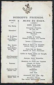 The club, often referred to simply as Nobody's Friends or Nobody's, was founded in honour of William Stevens and first met on 21 June 1800 at the Crown and Anchor Tavern in the Strand. Its inaugural dinner consisted of thirteen men who would later form the movement known as the Hackney Phalanx.[4] In the late 1880s Nobody’s occasionally met at the Freemasons' Tavern, which served as a meeting place for a variety of notable organisations from the eighteenth century until it was demolished to make way for the Connaught Hotel in 1909.[5]