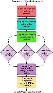 Clustal Omega has five main steps in order to generate the multiple sequence alignment. The first is producing a pairwise alignment using the k-tuple method, also known as the word method. This, in summary, is a heuristic method that isn't guaranteed to find an optimal alignment solution, but is significantly more efficient than the dynamic programming method of alignment. After that, the sequences are clustered using the modified mBed method.[21] The mBed method calculates pairwise distance using sequence embedding. This step is followed by the k-means clustering method. Next, the guide tree is constructed using the UPGMA method. This is shown as multiple guide tree steps leading into one final guide tree construction because of the way the UPGMA algorithm works. At each step, (each diamond in the flowchart) the nearest two clusters are combined and is repeated until the final tree can be assessed. In the final step, the multiple sequence alignment is produced using HHAlign package from the HH-Suite, which uses two profile HMM's. A profile HMM is a linear state machine consisting of a series of nodes, each of which corresponds roughly to a position (column) in the alignment from which it was built.[22]