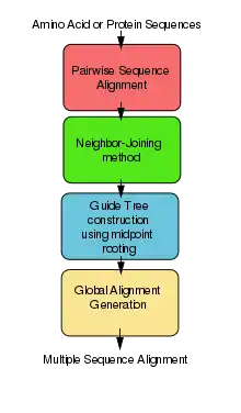 ClustalW uses progressive alignment methods as stated above. In these, the sequences with the best alignment score are aligned first, then progressively more distant groups of sequences are aligned. This heuristic approach is necessary due to the time and memory demand of finding the global optimal solution. The first step to the algorithm is computing a rough distance matrix between each pair of sequences, also known as pairwise sequence alignment. The next step is a neighbor-joining method that uses midpoint rooting to create an overall guide tree.[16] The process it uses to do this is shown in the detailed diagram for the method to the right. The guide tree is then used as a rough template to generate a global alignment.