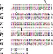 - Thompson JD, Higgins DG, Gibson TJ (November 1994). "CLUSTAL W: improving the sensitivity of progressive multiple sequence alignment through sequence weighting, position-specific gap penalties and weight matrix choice". Nucleic Acids Research. 22 (22): 4673–80. doi:10.1093/nar/22.22.4673. PMC 308517. PMID 7984417.
