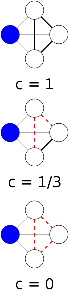 These measures are 1 if every neighbour connected to is also connected to every other vertex within the neighbourhood, and 0 if no vertex that is connected to connects to any other vertex that is connected to .