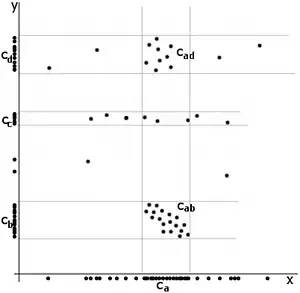 The adjacent image shows a mere two-dimensional space where a number of clusters can be identified. In the one-dimensional subspaces, the clusters (in subspace ) and , , (in subspace ) can be found. cannot be considered a cluster in a two-dimensional (sub-)space, since it is too sparsely distributed in the axis. In two dimensions, the two clusters and can be identified.