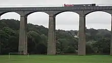 The Pontcysyllte Aqueduct was built by Thomas Telford in 1805 and is the largest aqueduct in the United Kingdom; it carries the Llangollen Canal over the River Dee and is a World Heritage Site, being considered a masterpiece of civil engineering.[36] The Clwydian Range and Dee Valley constitute an Area of Outstanding Natural Beauty, one of just five in the whole of Wales.[37] Denbigh, Colwyn and Ruthin are historic towns and Llangollen hosts the Llangollen International Musical Eisteddfod in July each year.[38]