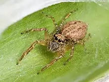 As with most salticidae spiders, members of this genus are known for their ability to jump with agility, and for their strong vision.[4] They are identifiable from the distinct shape of the cephalothorax and their eye patterns. Of their eight eyes, the front row of four feature a dramatically prominent anterior median pair, while the rear row of four eyes may be described as strongly bent, or as being rearranged into two rows, with two large posterior lateral eyes furthest back. These supply lateral vision, while the forward four are adapted to detailed, three-dimensional vision for purposes of estimating the range, direction, and nature of potential prey, permitting the spider to direct its attacking leaps with great precision.[5]