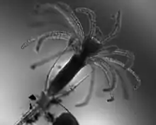 Clytia hemisphaerica reproduces sexually. Ovulated eggs are fertilized externally and take approximately 24 hours to develop into planula. The ciliated planula will swim freely until the proper external cues, for instance, experimental treatment with CsCl,[6] trigger the metamorphic process. The planula can undergo its metamorphosis into a polyp as soon as three days after fertilization. Once the proper external cue is received, the planula stops swimming and attaches itself to a substrate via its aboral or aboral-lateral pole (what was previously the front end of the swimming planula). After attaching itself to a substrate, the planula contracts along its oral–aboral axis and so forms a flattened holdfast to anchor itself to the substrate. Once the planula is securely on its substrate, a stalk grows out of the holdfast and, eventually, a hydranth, also known as a gastrozooid (an individual polyp specializing in feeding) forms on the anterior end of the stalk. At this stage, the planula is now considered a primary polyp, and this polyp can propagate vegetatively by extending its stolon to form a connected colony of multiple polyps. Polyp colonies are essentially considered immortal; as long as they receive the proper nutrients, they can continuously replace their old parts and expand across their substrate. In addition to the feeding gastrozooids, a mature polyp colony has reproductive gonozooids that produce baby medusa by budding.[7] These medusa reach maturity after 2–3 weeks.