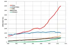 In 2018, coal mining decreased to 755 million short tons, and American coal consumption reached its lowest point in nearly 40 years.[17] In 2017, U.S. coal mining had increased to 775 million short tons.[3] In 2016, US coal mining declined to 728.2 million short tons, down 37 percent from the peak production of 1,172 million tons in 2008. In 2015, 896.9 million short tons of coal were mined in the United States,[18] with an average price of $31.83 per short ton,[19] worth $28.6 billion.[20][21]