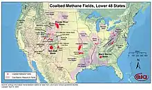 The 2017 production of coalbed methane in the United States was 0.98 trillion cubic feet (TCF), 3.6 percent of all US dry gas production that year. The 2017 production was down from the peak of 1.97 TCF in 2008.[1] Most coalbed methane production came from the Rocky Mountain states of Colorado, Wyoming, and New Mexico.