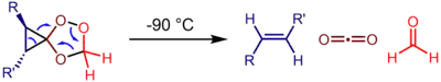 The most well-known example of a coarctate transition state is that of the epoxidation of an olefin by dimethyldioxirane.[3] In this transition state, the oxygen atom transferred to the olefin forms a cycle with the acetone leaving group and a cycle with the olefin undergoing epoxidation. Another well-studied reaction is the fragmentation of spirocyclic ozonides into formaldehyde, CO2, and an olefin.