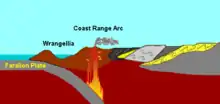 The final event began when the Farallon Plate continued to subduct under the new continental margin after the Insular Plate and Insular Islands collided with the old continental margin, supporting a new continental volcanic arc called the Coast Range Arc about 100 million years ago during the Late Cretaceous period.[7] Magma rising from the Farallon Plate under the new continental margin ascended through the newly accreted Insular Belt, injecting huge quantities of granite into older igneous rocks of the Insular Belt.[6] At the surface, new volcanoes were built along the continental margin.[6] Named after the Coast Mountains, the basement of this arc was likely Early Cretaceous and Late Jurassic intrusions from the Insular Islands.[7]