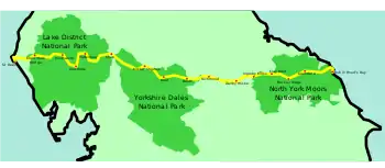 The Coast to Coast Walk is a long-distance footpath between the west and east coasts of Northern England, nominally 190-mile (306 km) long. Devised by Alfred Wainwright, it passes through three contrasting national parks: the Lake District National Park, the Yorkshire Dales National Park, and the North York Moors National Park.[1] The current actual measured distance is reported as 182-mile (293 km).[2]