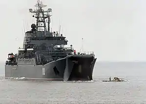 The Coastal Troops (Russian: Береговые войска, romanized: Beregovyye voyska) are a service arm of the Russian Navy, designed to guard Russian fleets' forces, personnel, and seashore objects against exposure to enemy surface ships; to defend naval bases and other important facilities of the Fleets from the land, including against amphibious and air assaults; to be landed and act in the course of amphibious and air assaults; to support the Russian Ground Forces in the course of defence against airborne and amphibious assaults; to destroy surface ships, boats and amphibious transport means within the fire envelope.[2]