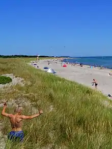 The coastline of Djursland in Denmark is 260 kilometers long as measured from the ferry berth in Voer in the middle of Randers Fjord ending at Avlsgård in Aarhus Bay to the south.[1] There are 18 sandy beaches for swimming along the coastline according to the folder, Kystkort Djursland (Coastal Map Djursland) published by the peninsula's two municipalities, Norddjurs and Syddjurs.[2] These beaches cover 15 – 20%. of the total coastline.[1] The remaining 200 plus kilometres are mostly unspoiled coastal nature.