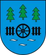 The current coat of arms of Czersk consists of a Iberian style escutcheon (shield) with square top and rounded base, with the aspect ratio of its height to its width equal 7:6. The shield is divided horizontally into two fields, a white (silver) on the top, and blue on the bottom. On the white field are placed horizontally three spruce trees, while within the blue field are three small white (silver) wavy lines, stylized to look like waves on the water. In the centre of the coat of arms, on the boundary of two fields, is placed a black water wheel, and to its right, and its left, are black water dams.[1]
