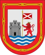 In the silver field, a castle of its color (old stone), and to its sinister a rampant crowned lion, of a red color, holding a flagpole also of its color, with a flag of gules (red) loaded with a silver cross, all placed on water waves of blue and silver. Bordure of gules (red) loaded with a chain of eight golden links.[2]
