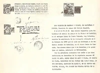 - Reproduction of part of the research documents of Vicente de Cadenas y Vicent, taken from the book Crónica Municipal (1967), "Capitulo: Armas para la Villa 1678" by Hernán Escobar Escobar, p. 180.