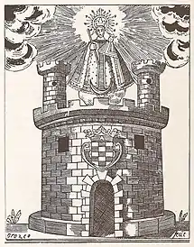 Between the turrets and on a cloud the hagiographic figure of the Virgin poses, who has a voluminous dress, in her right hand holds a candle (or flame) and in her left arm the Child, at her feet is a crescent moon and below it a cherub. On the head is a halo containing 19 points or rays and ends at the top in a cross, besides it emerges a glow that makes its way between two lateral clouds. Only the cloud in the center, the Virgin and the Child are indicated in the document, the other elements are part of the iconography of the Virgin of Candelaria, for this reason they are found in the drawing.[12]