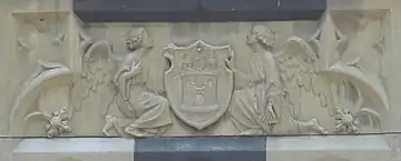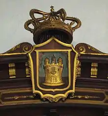 On the door of the tower there is a coat of arms (arms of the House of Portocarrero), which has some ornaments around it, as a bell it has an enhanced and open crown, on each side of the escutcheon there is a fleur-de-lis, and surrounding the coat of arms there are two lambrequins. These last two ornaments are not mentioned in the description of the royal decree.[12]